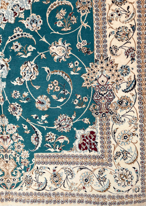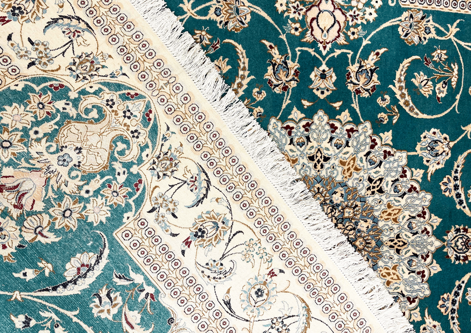Splendido Nain 6 fili, annodato con altissima densità (oltre 850.000 nodi/m²). Il campo verde smeraldo è dominato da un elaborato medaglione centrale azzurro, arricchito da motivi floreali e arabeschi di straordinaria precisione. I dettagli in seta illuminano i decori, donando profondità e brillantezza.